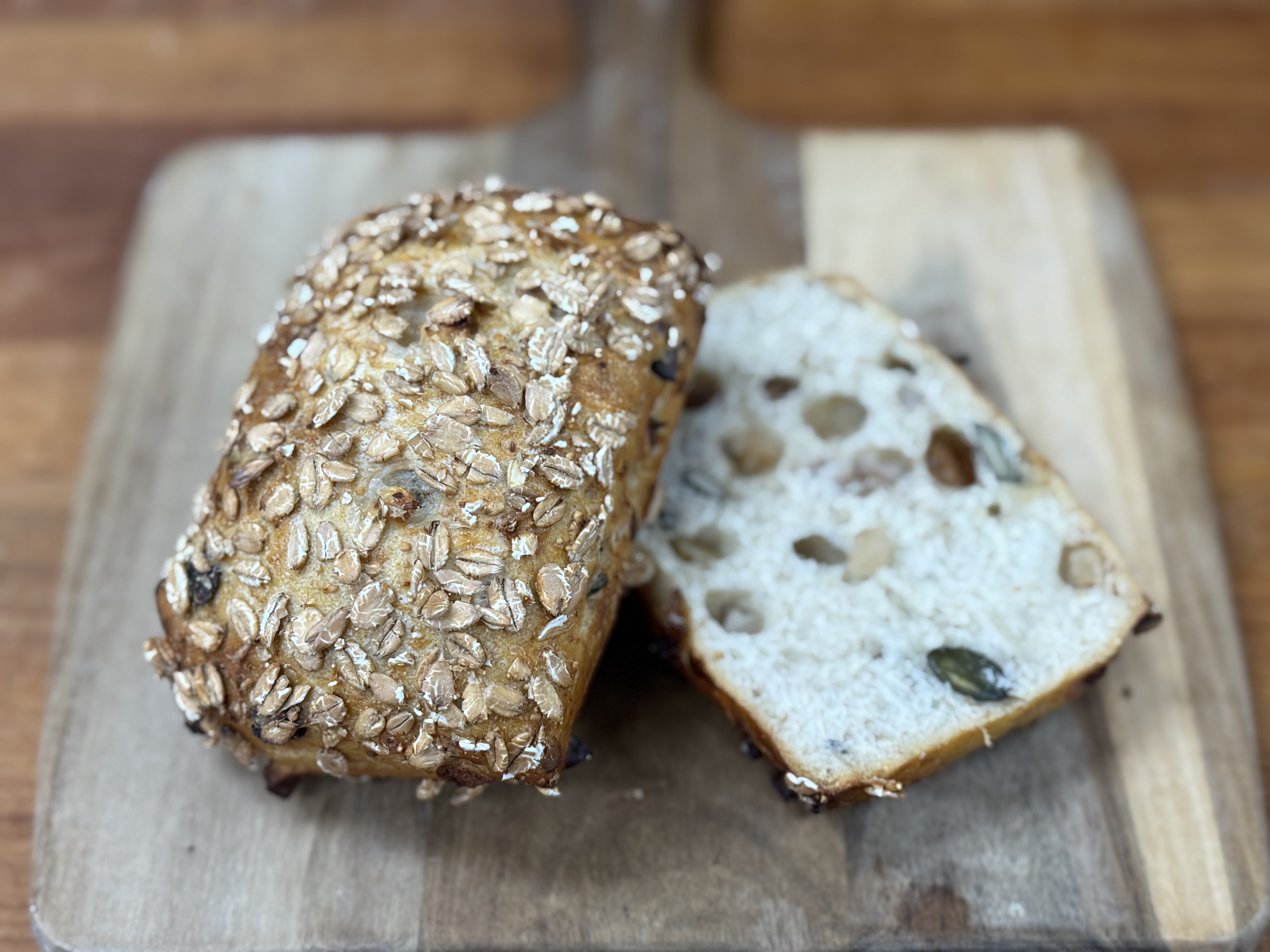 Morgenbrød med fuldkornshvedemel, hvedemel, rosin, tranebær, æbletern, og græskarkerner.